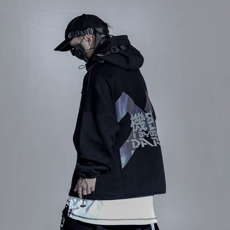 The design stands out with a fluorescence print on both the front and back that flashes in the dark , and a special techwear-inspired pocket on the front. It’s a loose fit for an oversized aesthetic (our 5’11”, 176 lb model wears a size L for this look, or a M for a regular fit). Key features include a drawstring hood , kangaroo pocket , straight sleeves and hem , and a turtleneck
